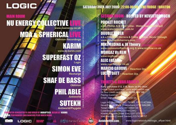 Over the past seven years Logic has played host to some of the most memorable live stage shows ever seen in the capital with Lab 4, K90, Captain Tinrib and the Nu Energy Collective having all regularly graced the Logic stage. It has long been famous as a party that pushes new acts and djs who go on to reach superstar status: Yoji Biomehanika played his first UK gig for Logic and Proteus has gone on to feature in the DJ Mag Top 100 DJs in both 2004 and 2005.